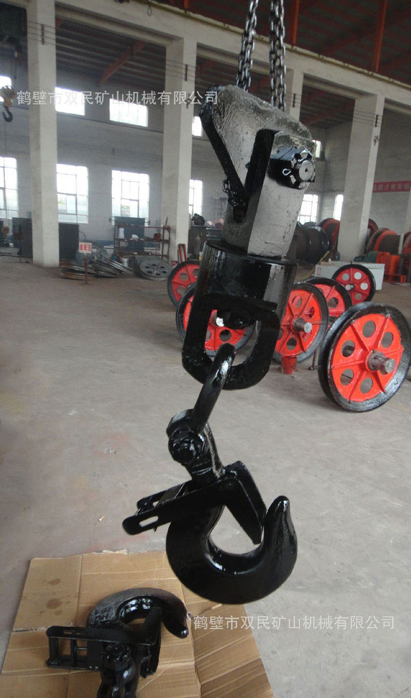 1.产品特点 钩头及连接装置,简称为钩头装置。该产品结构简单,使用性能单一。零件全部由锻件加工而成,钢丝绳连接采用了两种型式,其中5t、7t采用不偏心护绳环,板卡