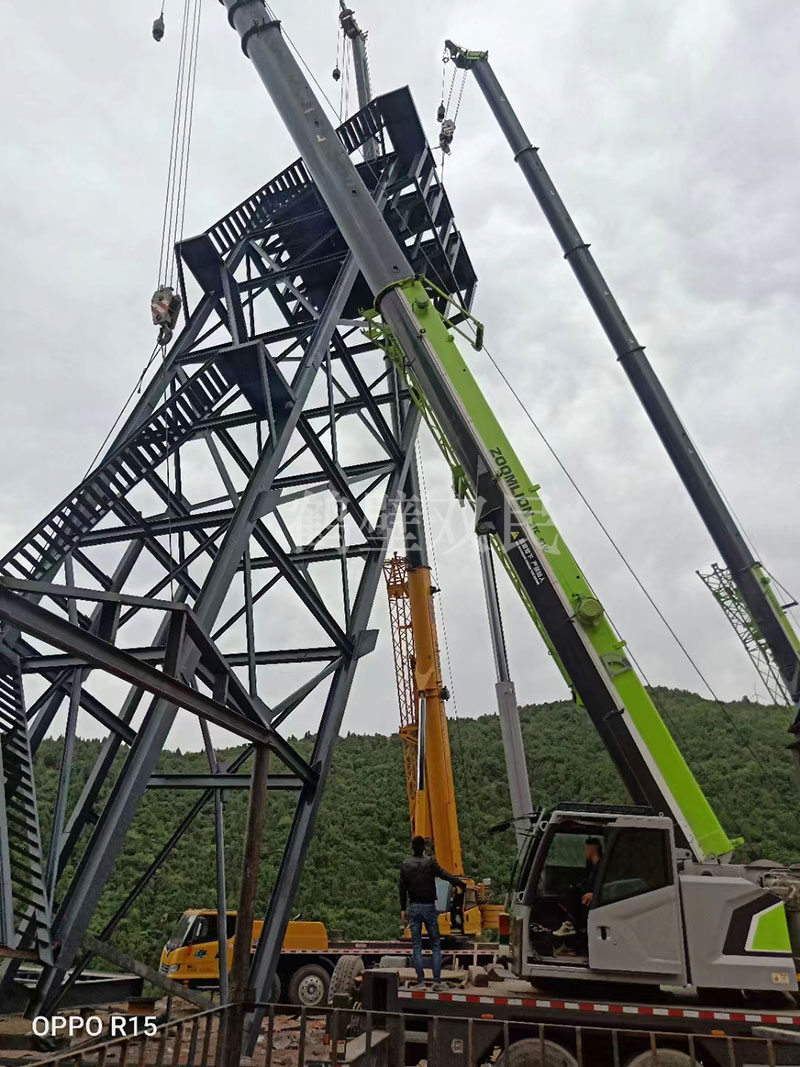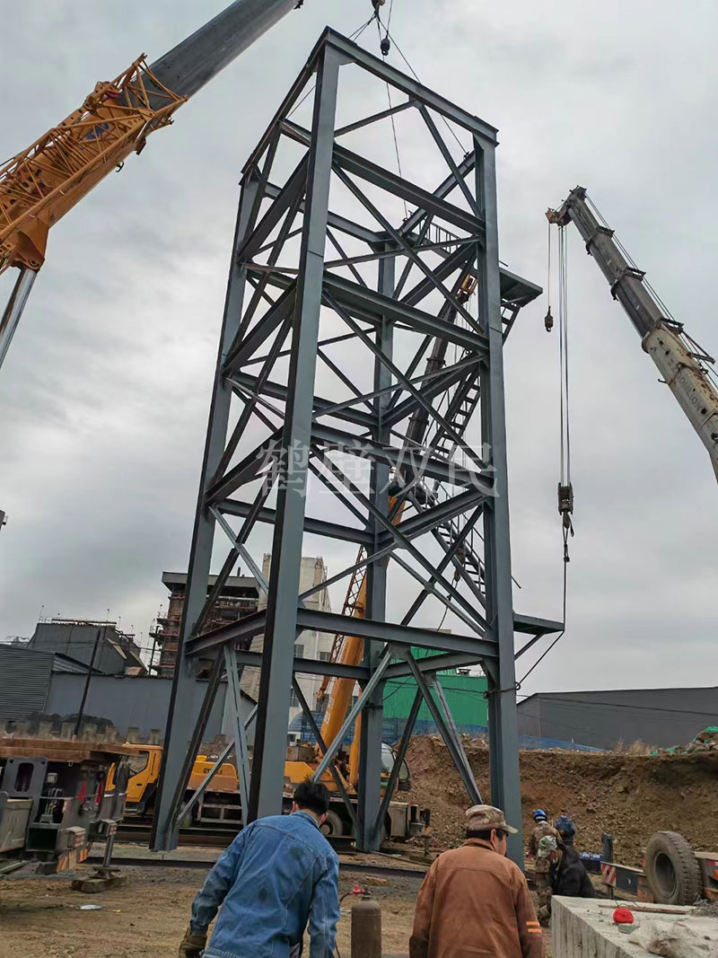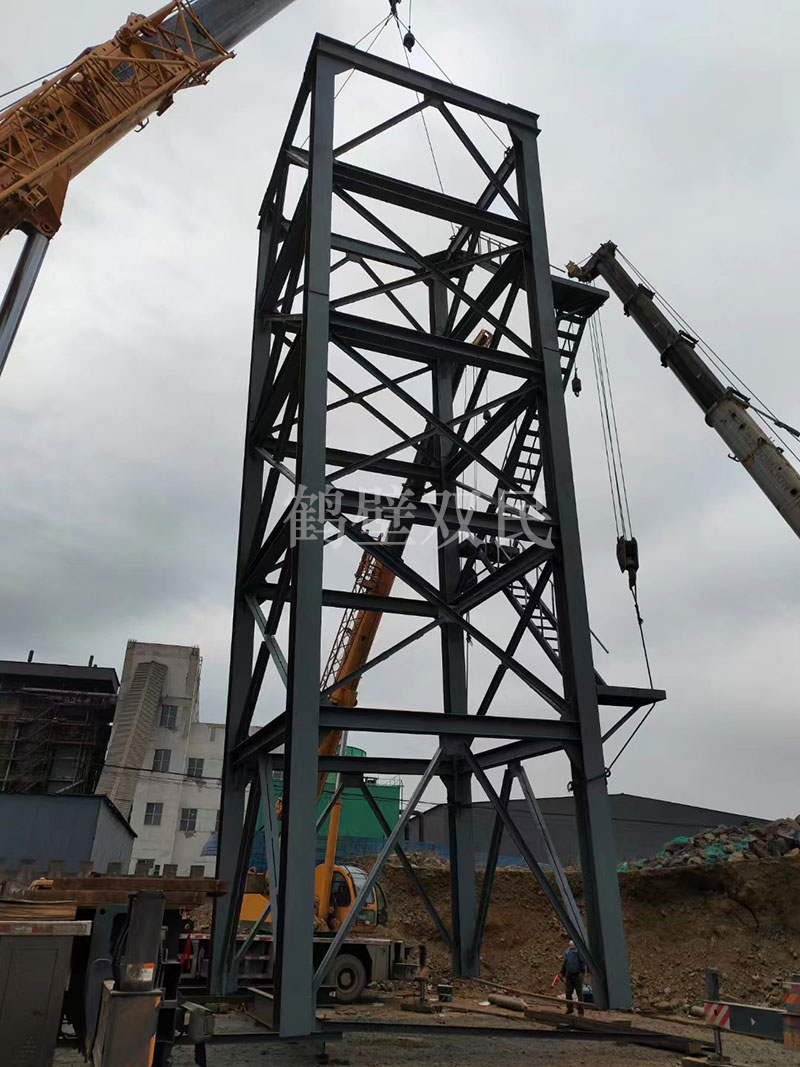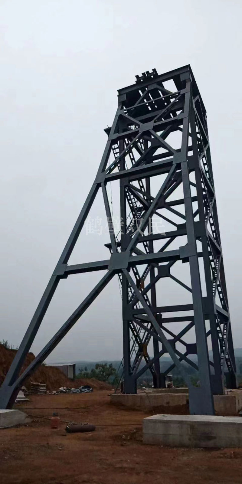斜撑式永久井架主要特征和优点: 单斜撑式井架是随着落地式多绳地上计技术发展而产生的,具有造型独特,结构简单,受力合理,工程量少,经济实用,技术进步的特点。