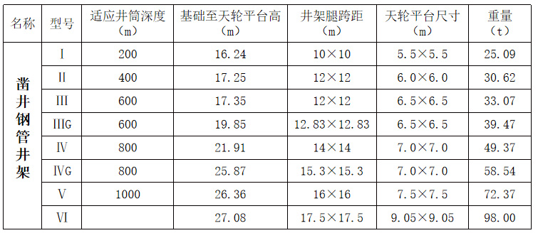 立井凿井钢井架系列主要采用钢管、型钢等焊接或螺栓连接而成,可满足井井3.5-11m,井深200-1000m的立井井筒施工及其工艺要求,在满足强度、刚度和稳定性的同时,做到机构合理,加工制