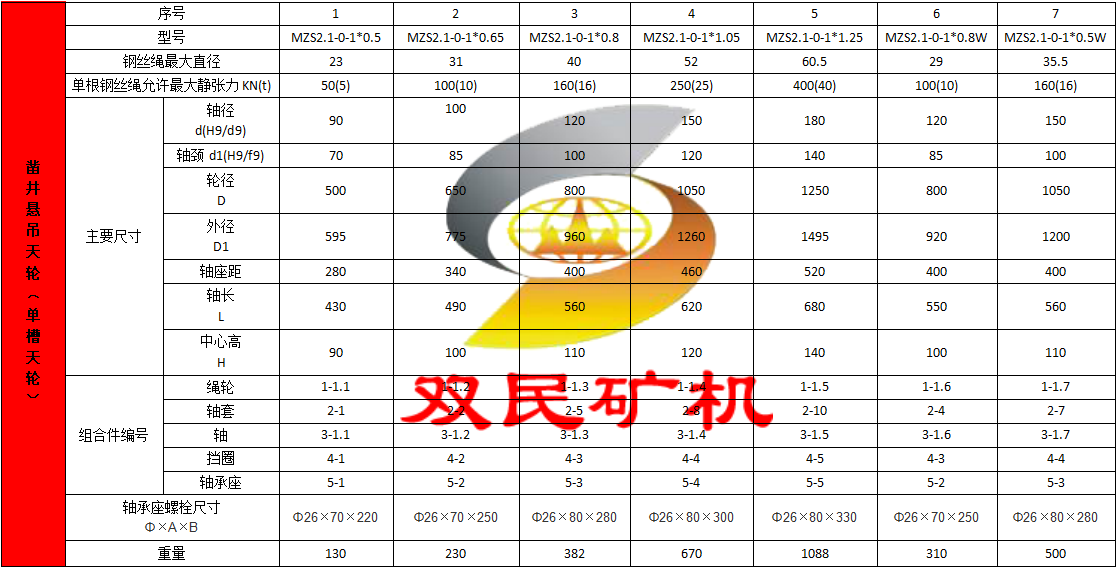 悬吊天轮又按凿井绞车的性能分为单槽天轮和双槽天轮两类,其中单槽天轮七种,双槽天轮十种。一律采用固定心轴、整体轴承座支承,轴承座和绳轮均采用HT20-40普通铸铁。