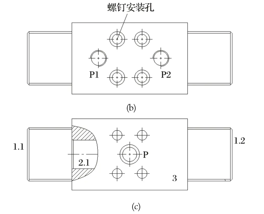 (2) 将两个插装阀组合设计成一个独立的液动换向阀,再安装到阀组油路块上。如图6 所示,独立的液动换向阀包含一个独立的阀体 3,两端分别安装有一个插装组件 2 和一个控制盖板 1;阀体内部设计有油孔,用于连接两端的插装阀;阀体外侧安装面上设计有两个进油孔 P1 和 P2,通过管接头连接两个泵装置;阀体内侧安装面上设计有一个出油孔 P,阀组油路块上只需要设计一个与出油孔 P 配套的供油孔即可;阀体上设计有螺钉安装孔,用于将液动换向阀安装在阀组油路块上。