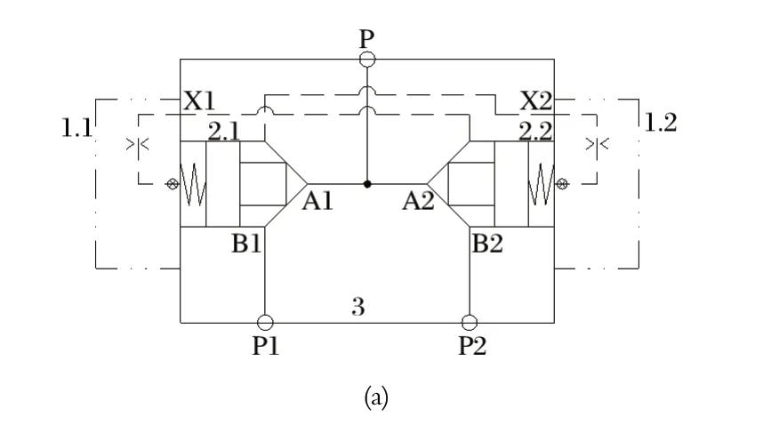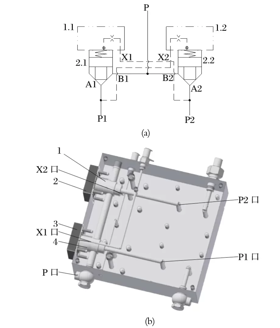 新型液动换向阀是由两个二通插装阀组合而成的选择回路,具备二位三通方向控制阀功能,以实现两套泵装置的切换。中信重工 E6118B/E6119B 型液压站的液压阀组如图5 所示。图5 中,当 P1 处的泵装置工作时,插装组件 2.1 打开,插装组件 2.2 关闭,由 P1 处的泵装置向 P 口供油,P2 处的泵装置可以维修或停用待命;反之,当 P2 处的泵装置工作时,插装组件 2.2 打开,插装组件 2.1 关闭,由 P2 处的泵装置向 P 口供油,P1 处的泵装置可以维修或停用待命。