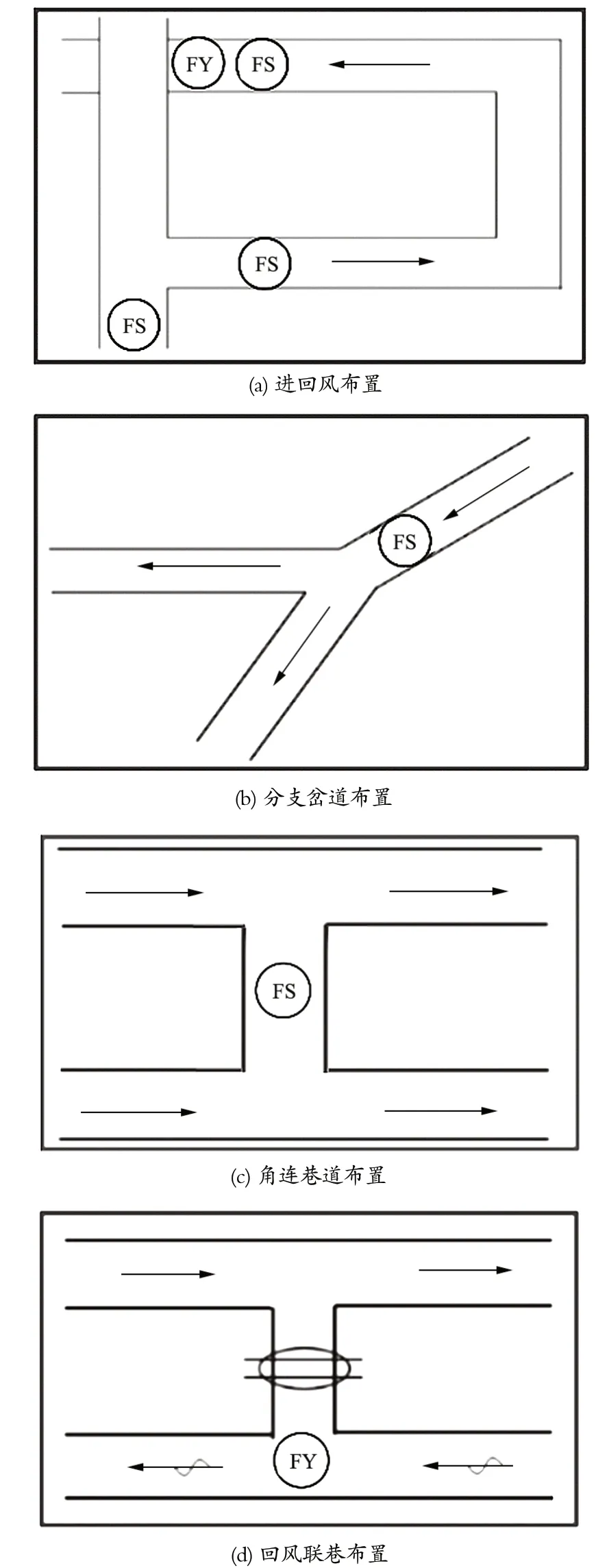 针对井下各地点作业内容与通风不同方式,尤其是在绕道车场、分支岔路巷道和联络巷等地点,需要安装传感器进行监测。此外,在 Y 形和 U 形通风方式的采煤工作面回风流侧也容易出现风流不稳定现象;在主要运输大巷、掘进工作面设置有调节风窗的风门前后,由于运输需要经常开启风门,容易导致风流扰动影响较大,产生局部风速、风压变化。这些地点均需要安装传感器加强监测。