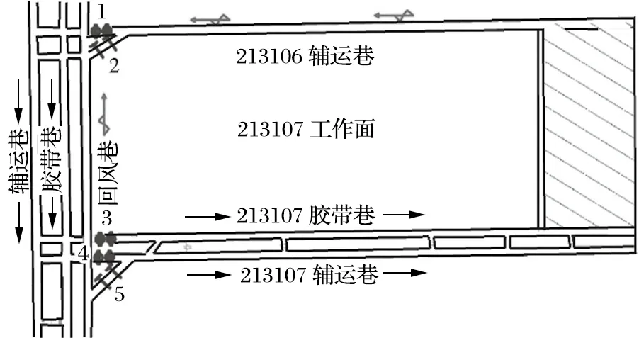 以213107 工作面为例,分别在 213106 辅运巷安装 2 道风门,213107 胶带巷安装 1 道风门,在 213107辅运巷及专回各安装 1 道风门。采煤工作面风流优化系统如图4 所示。其中编号 1、3、4 为自吸风门;编号 2、5 为自调节风门。正常通风时,打开 2、3、4 等风门,形成 U 形全负压通风,关闭 1、5 风门形成闭合回路;发生灾变需要反风时,则打开关闭的 1、5风门,形成风向逆流,由 1 号风门进风,5 号风门回风,其余 2、3、4 号风门关闭,可实现反风效果。