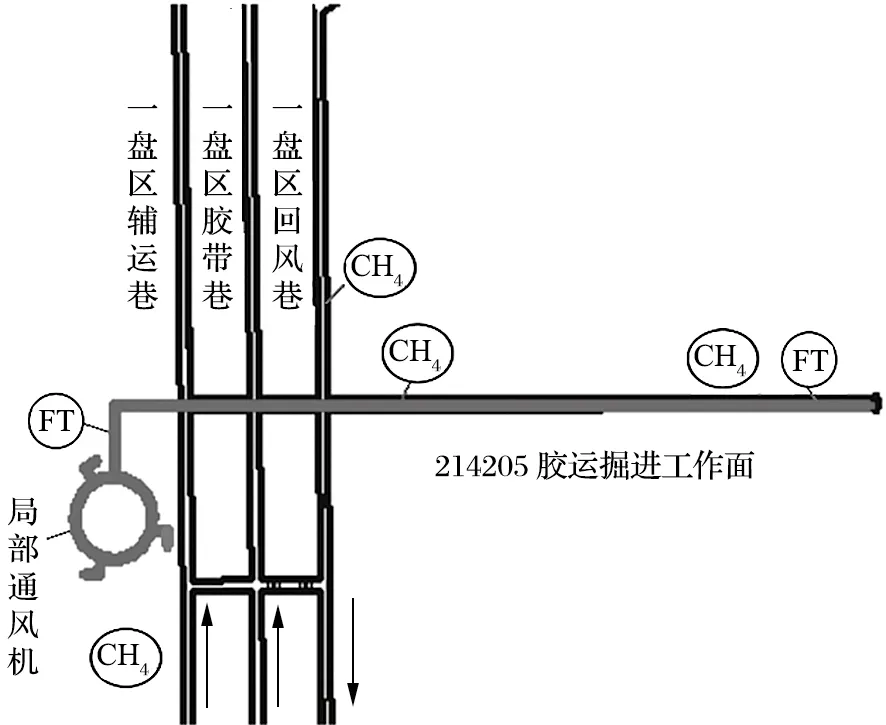 3.3.3 掘进工作面优化方案 在掘进工作面新鲜风流进风侧安装有 2 台变频轴流式局部通风机,在巷道风门里正头、专回口安装有甲烷传感器。对风筒安装风压传感器,结合掘进期间实际瓦斯涌出量和浓度指标,系统自行计算供风量是否满足风排瓦斯需求,通过变频实现风量调节。掘进工作面优化布置如图6 所示。