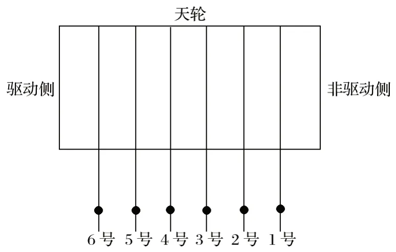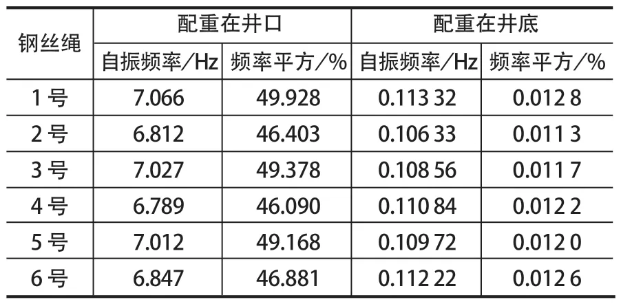 钢丝绳张力测试在 2 种工况下进行,分别是配重在井口时和配重在井底时。测试时,提升机要保持静止状态,用小锤依次敲击钢丝绳,并用测振仪器记录数据。从非驱动侧到驱动侧的钢丝绳编号为 1~6,如图 2 所示。钢丝绳振动测试结果如表 1 所列。