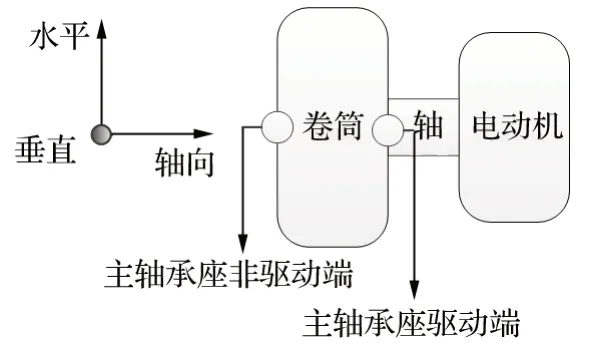 在提升机正常运行下,利用测振仪器对电动机和滚筒的连接主轴承进行振动检测,经过仪器自带的软件进行频谱分析后得到振动频谱图,再与轴承的故障频率进行比对,从而判断频谱中是否存在轴承的故障频率,进而确定主轴承是否存在故障。主轴承振动测试测点及方向如图 1 所示。