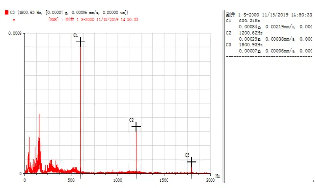 由图 7、8 可知,振动的主频率中没有轴承故障特征频率,表明轴承运行状态良好,未出现故障。但是在水平和垂直方向的频谱图中,都发现 600 Hz 频率及其倍频成分,且该频率成分的幅值zui高,其对应的是 2 倍的 SCR (全波整流可控硅故障特征频率)。在频谱图中出现此频率,说明电控系统出现故障,导致提升机运行速度不稳,与前面测试的速度图可以相互印证。