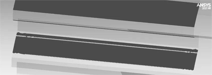 在 SolidWorks 中对同步齿轮进行建模并调整,确保同步齿轮不会出现干涉。为了提高仿真精度和数据的可靠性,对静强度仿真过程中参与啮合的几对轮齿表面网格化。齿面网格细化模型如图5所示。