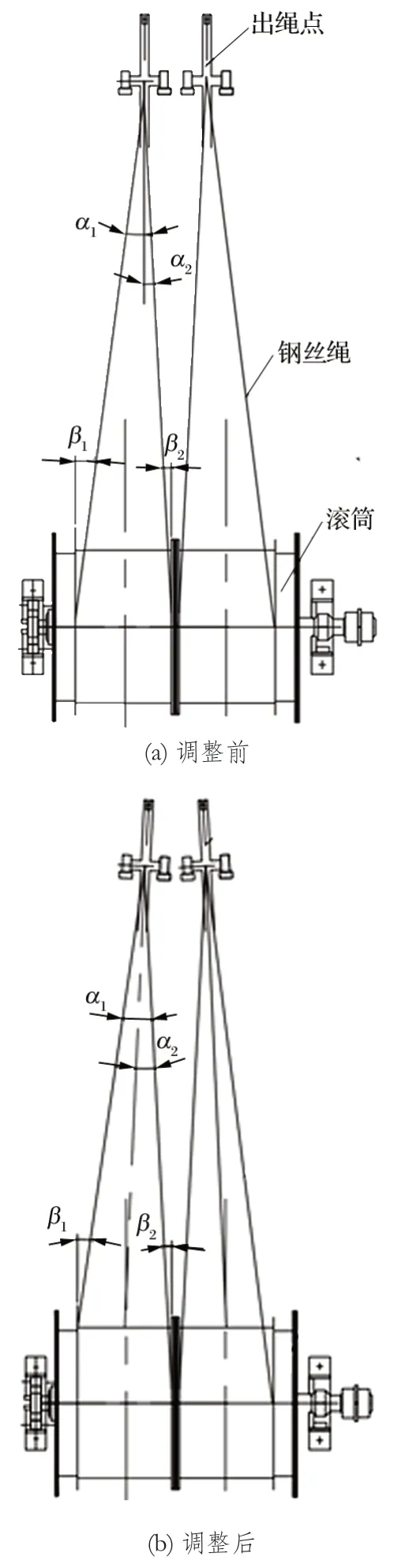 图4 调整前后钢丝绳内外偏角对比示意